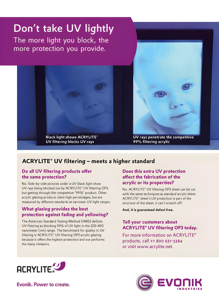 ACRYLITE® UV filtering (OP3) acrylic products offers museum-quality UV protection, and the beautiful clarity of the finest picture frame glazing, without the heaviness or breakability. It is a safer alternative at half the weight of glass, many times more resistant to impact, easier to handle, and more economical to ship.